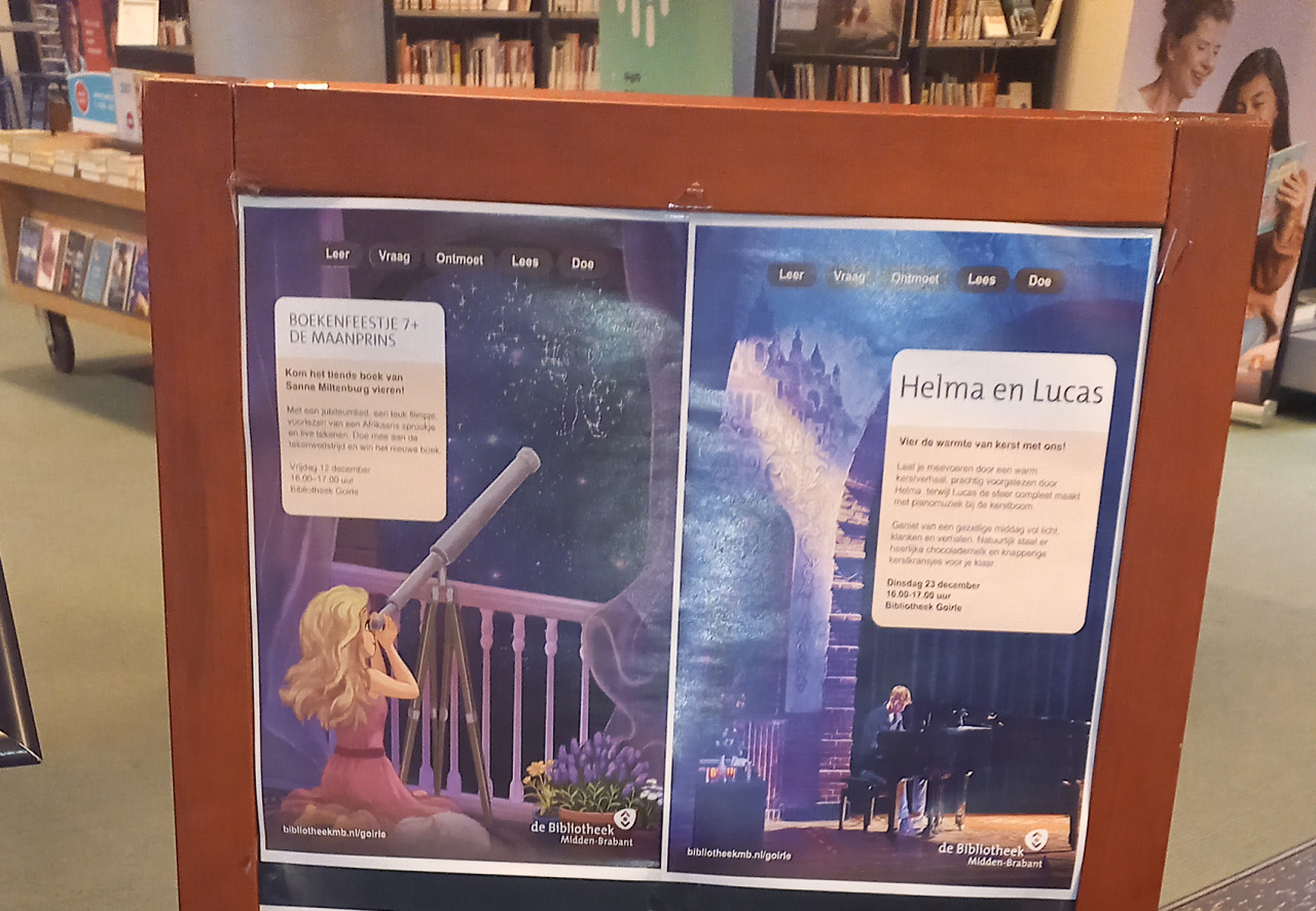 Bij de bibliotheek stond het boekenfeestje ook al aangekondigd met een poster. Zie de foto onderaan dit blogbericht.