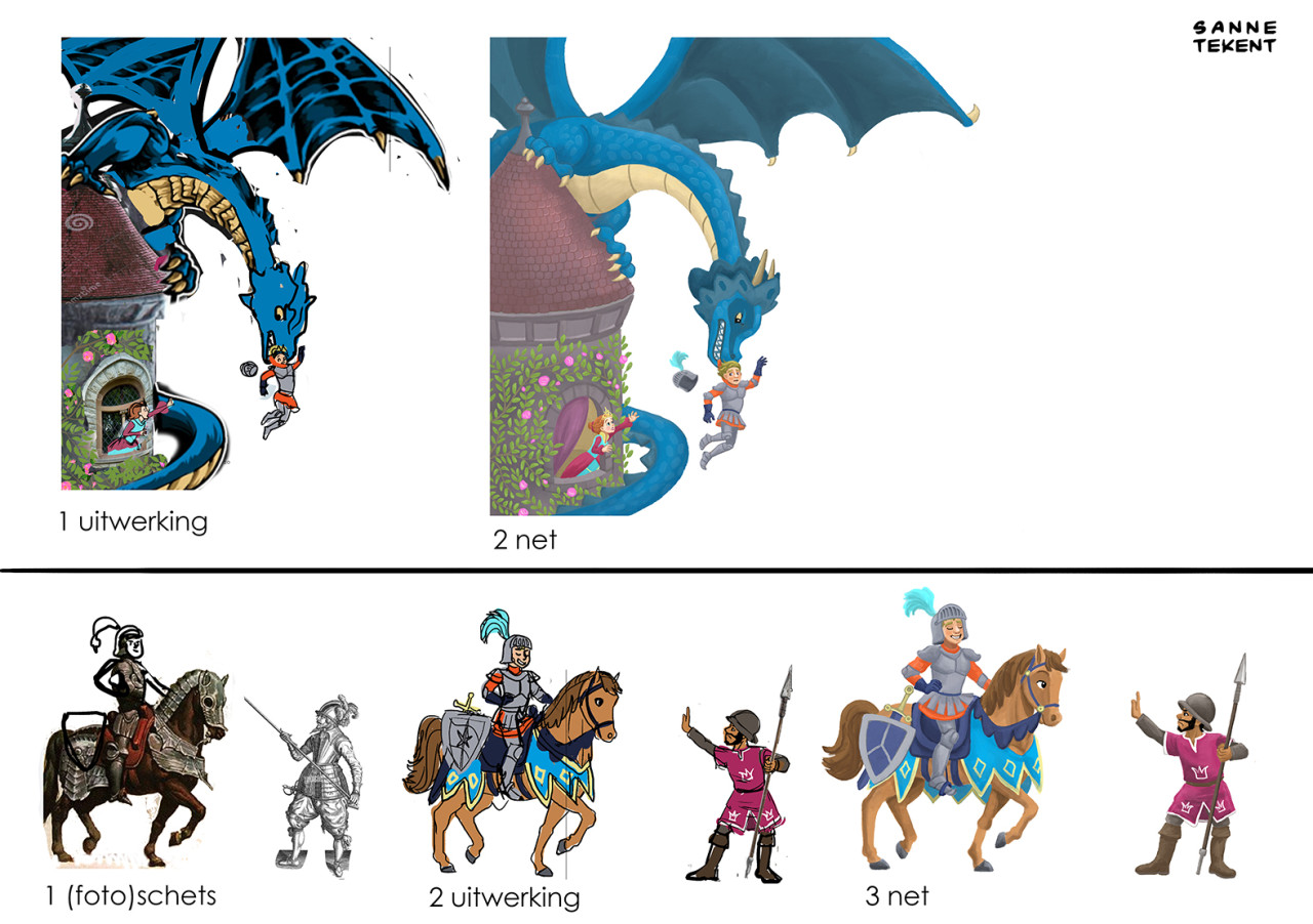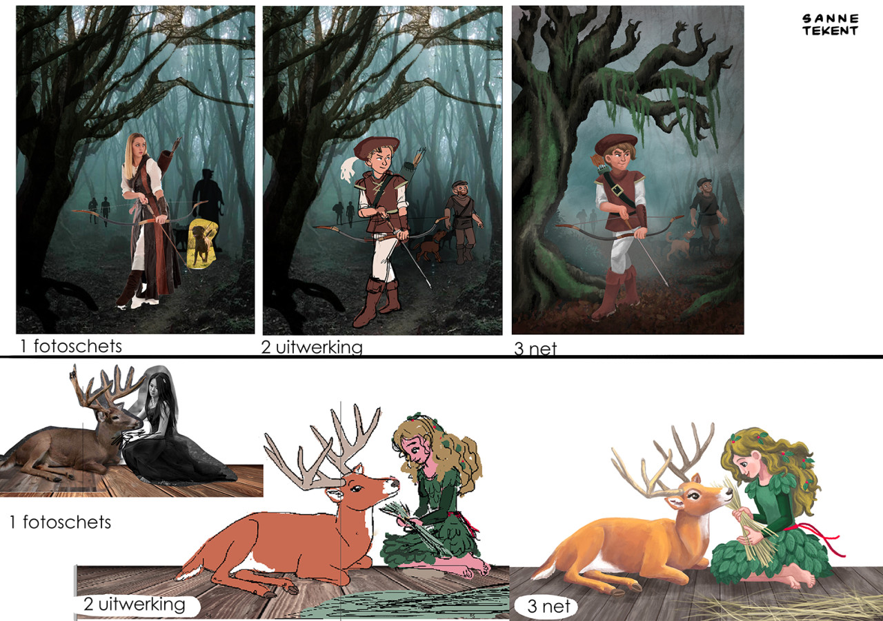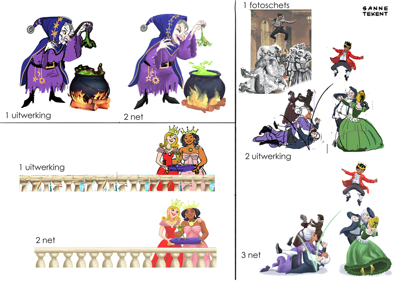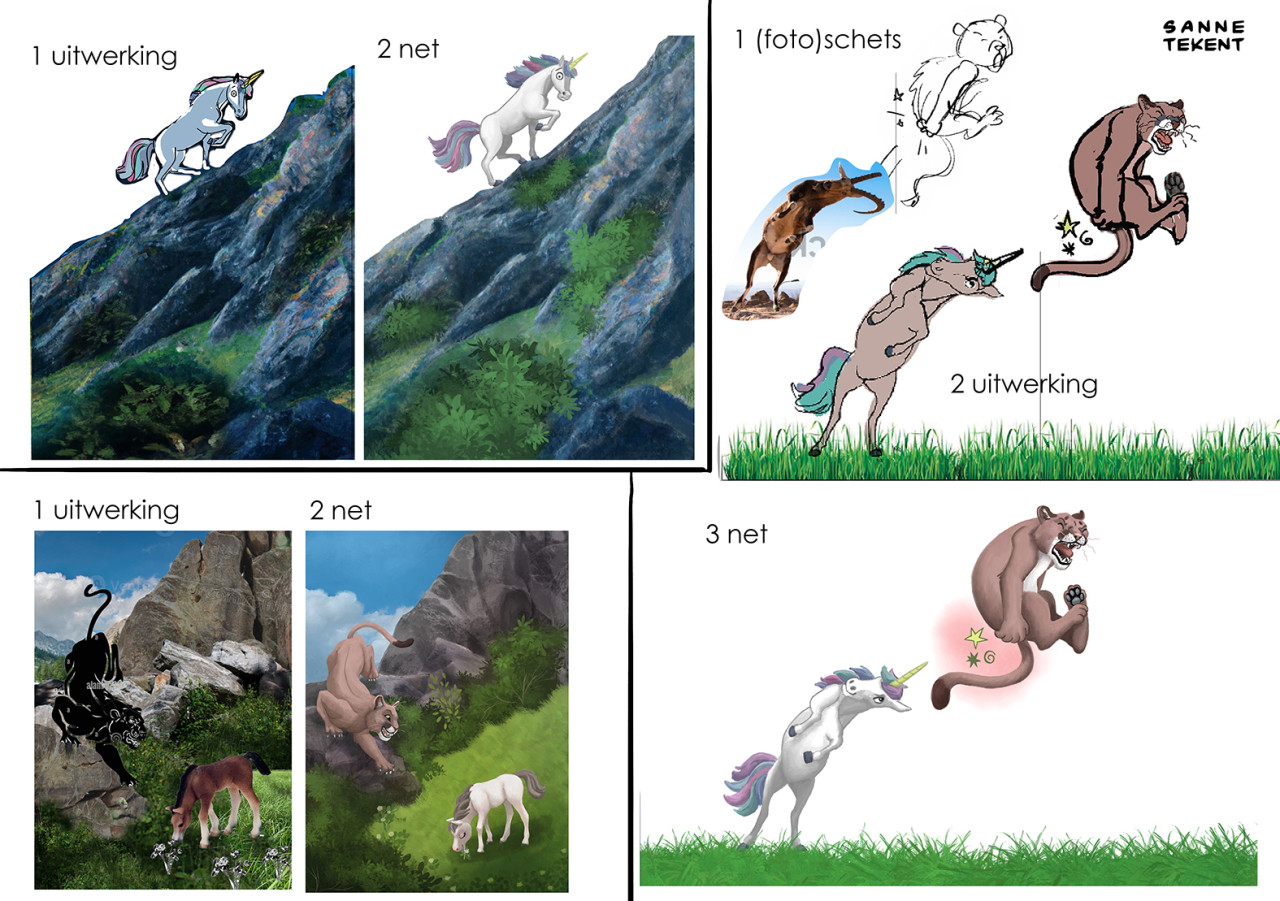 Voor de opzetten van de eerste schetsen gebruik ik soms delen van foto's, en die hoeven niet logisch aan te sluiten. Zo gebruikte ik de foto van een klein vogelkooitje om tijgerkooien in een tuin weer te geven. En de foto van een geit die met zijn horens aanvalt voor de houding van een eenhoorn. Of de foto van een breakdancer voor de houding van een prins die met kikkersprongen door een balzaal stuitert. Wat werkt, werkt!