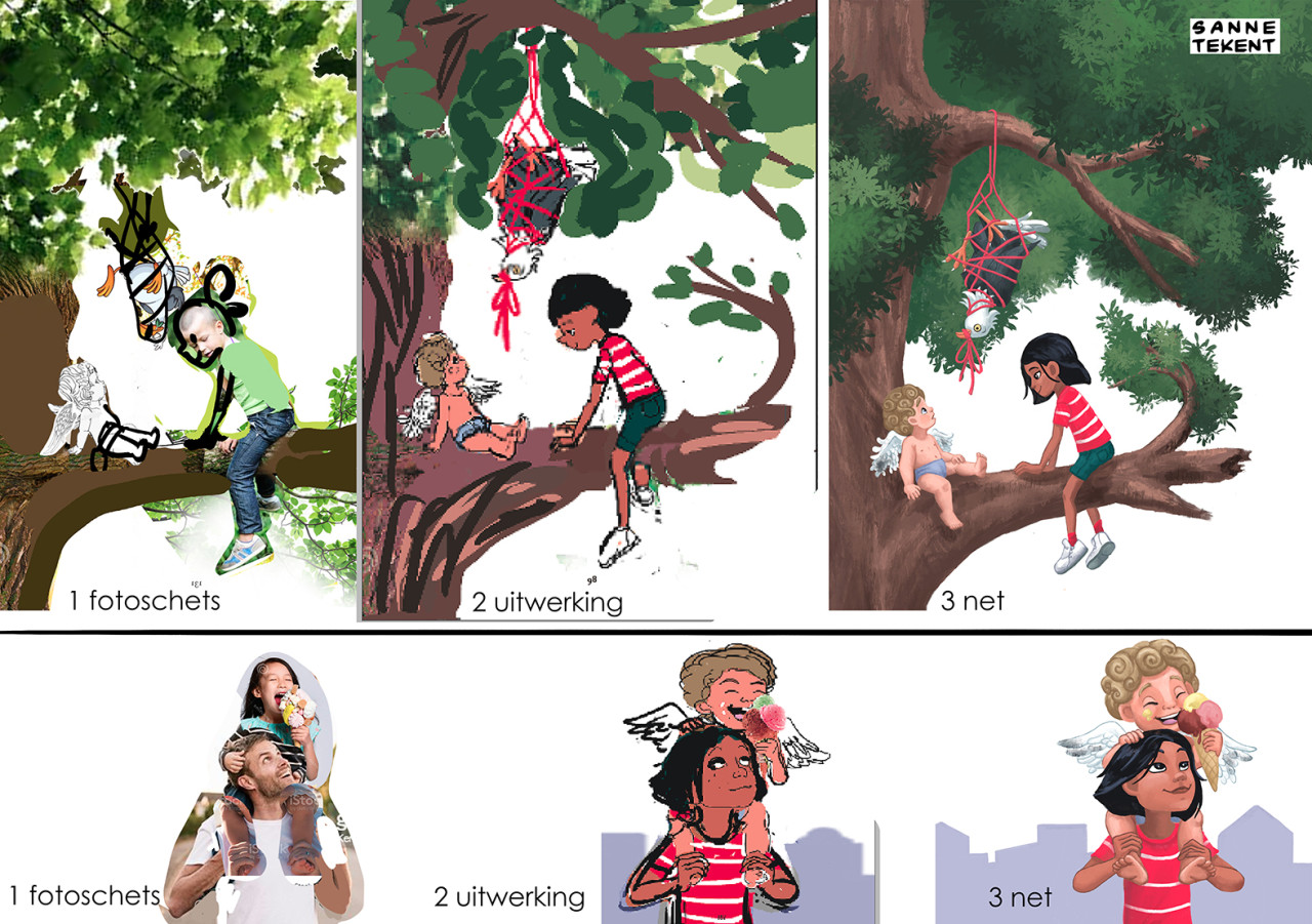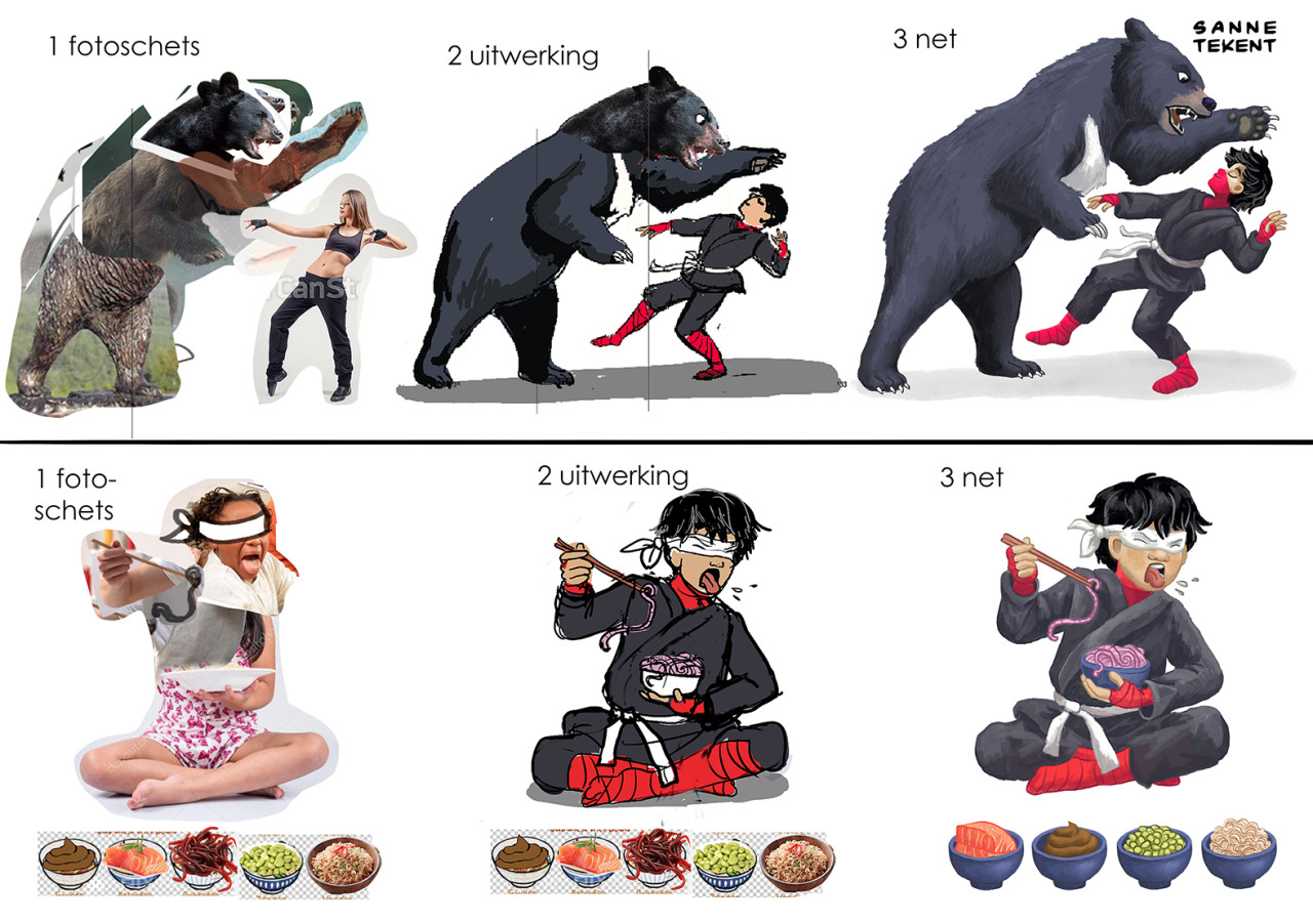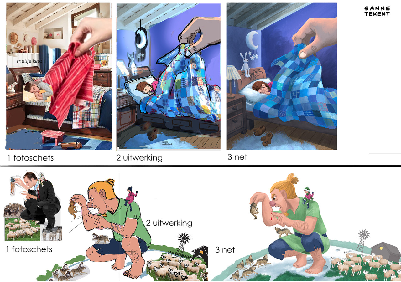 Voor de opzetten van de eerste schetsen gebruik ik soms delen van foto's, en die hoeven niet logisch aan te sluiten. Zo gebruikte ik de foto van een klein vogelkooitje om tijgerkooien in een tuin weer te geven. En de foto van een geit die met zijn horens aanvalt voor de houding van een eenhoorn. Of de foto van een breakdancer voor de houding van een prins die met kikkersprongen door een balzaal stuitert. Wat werkt, werkt!