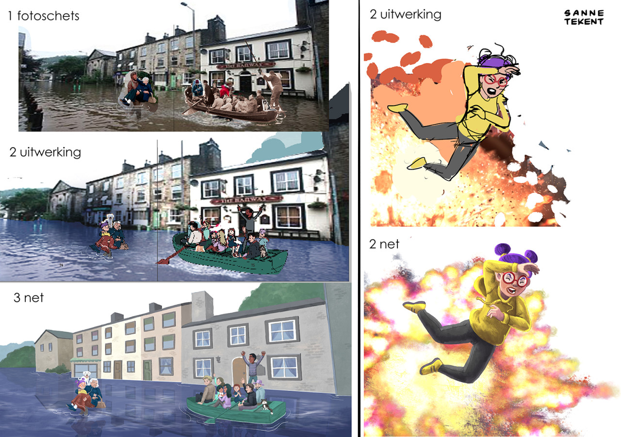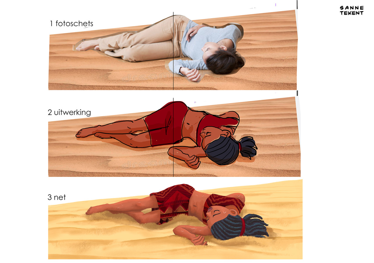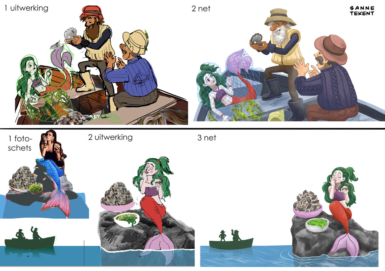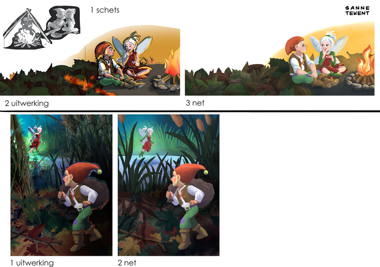 Voor de opzetten van de eerste schetsen gebruik ik soms delen van foto's, en die hoeven niet logisch aan te sluiten. Zo gebruikte ik de foto van een klein vogelkooitje om tijgerkooien in een tuin weer te geven. En de foto van een geit die met zijn horens aanvalt voor de houding van een eenhoorn. Of de foto van een breakdancer voor de houding van een prins die met kikkersprongen door een balzaal stuitert. Wat werkt, werkt!
