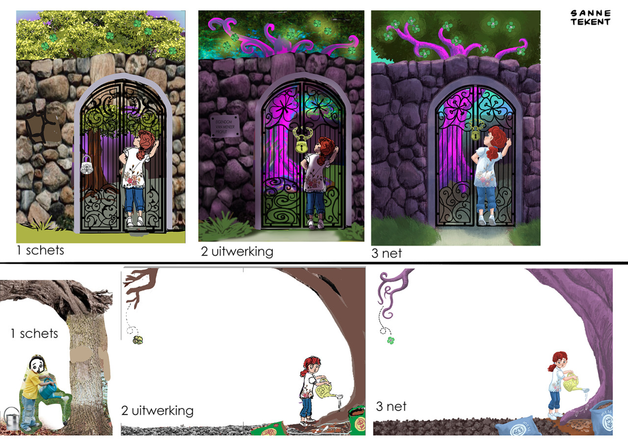 Bij het eerste voorbeeld van het meisje voor de poort moest het duidelijk zijn dat de boom achter de tralies een hele bijzondere boom is: er groeien namelijk geluksbloemen aan. Doordat ik de illustratie later donkerder maakte, lichtte de felpaarse boom lekker op en kwam hij mooi in de 'spotlight'. De vormen van de geluksbloemen (geïnspireerd op klavertjes vier) kwamen op een speelse manier terug in het traliewerk van de poort. Het meisje voor de poort is gek van planten, daarom gaf ik haar een delicate bloemenprint op haar witte blouse.