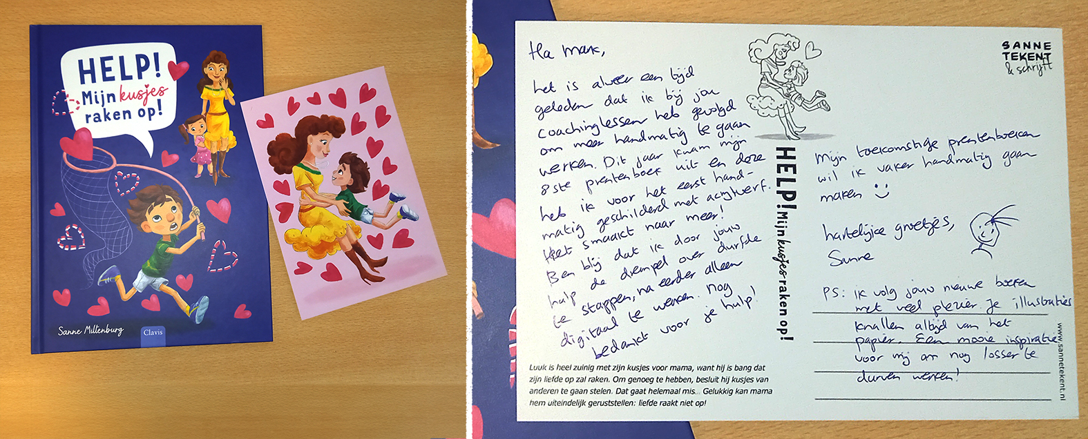Dit jaar bracht ik voor het eerst een handmatig gemaakt prentenboek uit, 'Help! Mijn kusjes raken op!' en ik ben