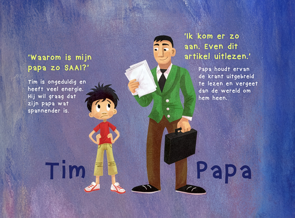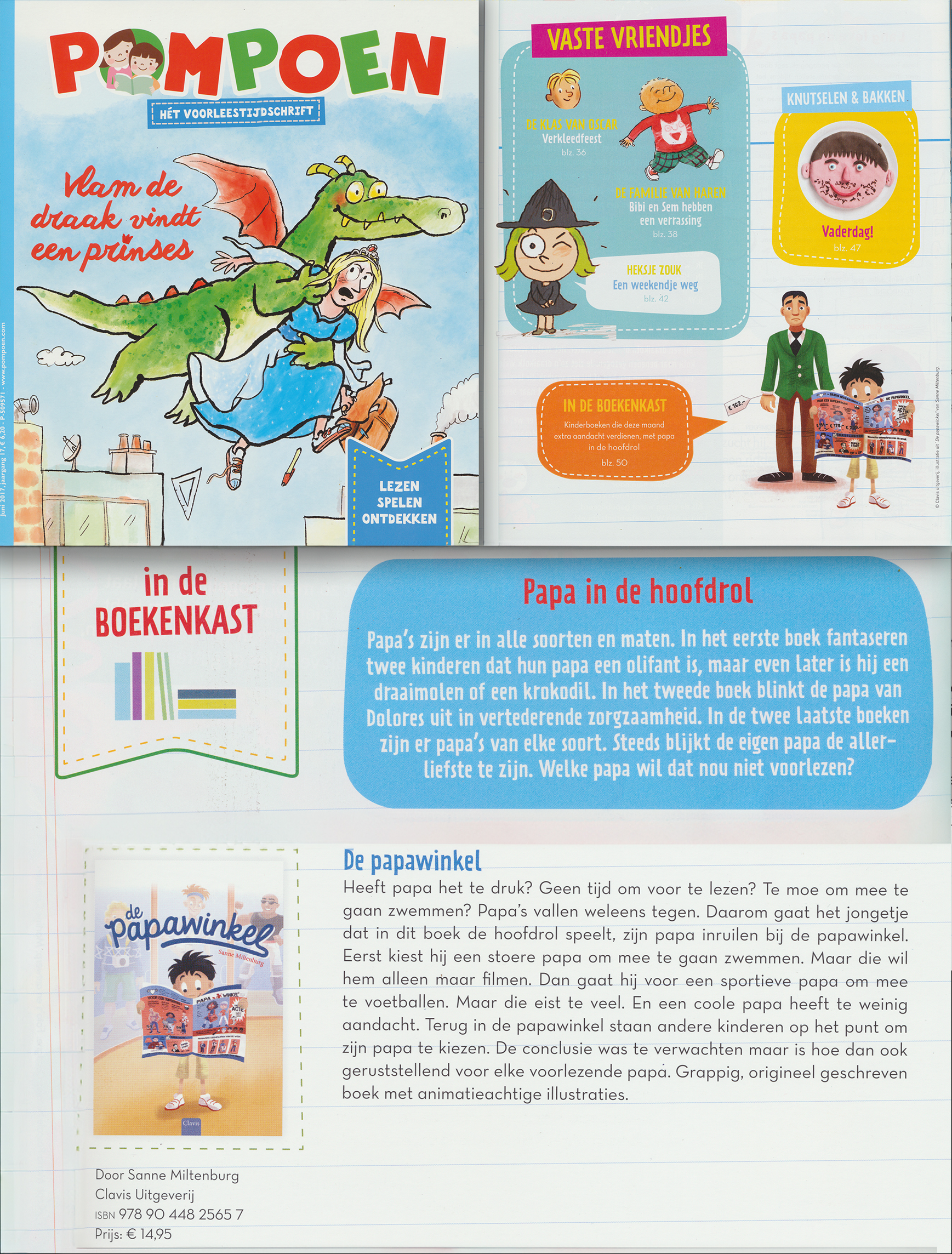Wat doe je met een papa die een tikkeltje saai is? Simpel: je ruilt hem in bij de Papawinkel! Daar hebben ze sportieve papa's, gekke papa's, supersterke papa's, papa's die de beste grappen vertellen... Vaders in alle soorten en maten! Maar wanneer een jongen een gloednieuwe vader moet uitkiezen, ontdekt hij iets verrassends: misschien – heel misschien – is zijn eigen vader wel perfect. Een hilarisch en o zo herkenbaar verhaal over vaders, zonen en wat familie zo bijzonder maakt. Voor alle nieuwsgierige kinderen vanaf 4 jaar. • thema’s: vader-zoon relatie • gedrukt prentenboek • uitgeverij Clavis, 2015 1ste druk, 2de druk Nederlands, 2022 herdruk Engels • 32 blz • Nederlands / Indonesisch / Italiaans / Koreaans / Chinees Simple / Engels / Thais / softcover versie Boektoppers / e-book Chinees / luisterboek Chinees • 4-8 jr • illustraties en tekst: Sanne Miltenburg