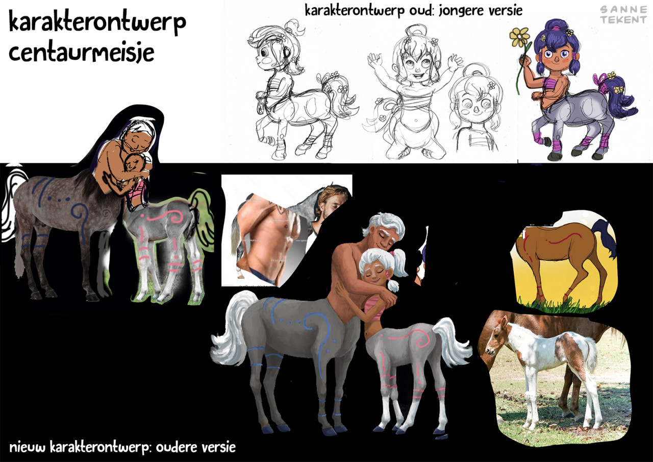 Ik liep al langer rond met het idee voor een verhaal met een centaurmeisje. Haar naam: Merry natuurlijk, met een knipoog naar het woord voor een vrouwelijk paard: merrie. 'Merry' betekent ook vrolijk, dus het kan ook best een gewone naam zijn. Ik vind het heerlijk om fantasiewezens te tekenen, en centaurs worden nog niet zo vaak gebruikt in moderne fantasieverhalen. De eerste versie van het meisje tekende ik haar nog vrij jong. Aangezien het verhaal later in deze sprookjesbundel kwam voor lezers van 7+ is het centaurmeisje aangepast naar een tienermeisje. Ik keek ook naar de verhoudingen van paarden, aangezien Merry nog niet volwassen is, heb ik voor haar onderlijf het visuele voorbeeld van een veulentje gebruikt. Haar vader speelt een rol in het verhaal, maar wordt visueel niet getoond. Toch had ik hem dus al ontworpen. Je kan niet altijd alles gebruiken wat je bedenkt, maar het is altijd handig -en leuk! - om dingen uit te proberen.