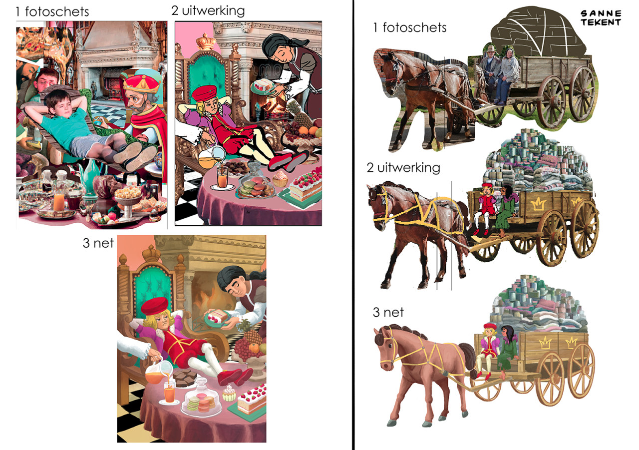 Voor de opzetten van de eerste schetsen gebruik ik soms delen van foto's, en die hoeven niet logisch aan te sluiten. Zo gebruikte ik de foto van een klein vogelkooitje om tijgerkooien in een tuin weer te geven. En de foto van een geit die met zijn horens aanvalt voor de houding van een eenhoorn. Of de foto van een breakdancer voor de houding van een prins die met kikkersprongen door een balzaal stuitert. Wat werkt, werkt!